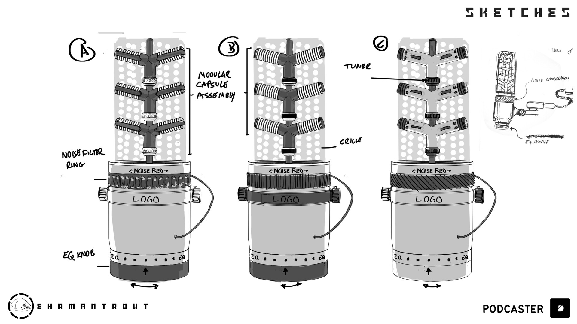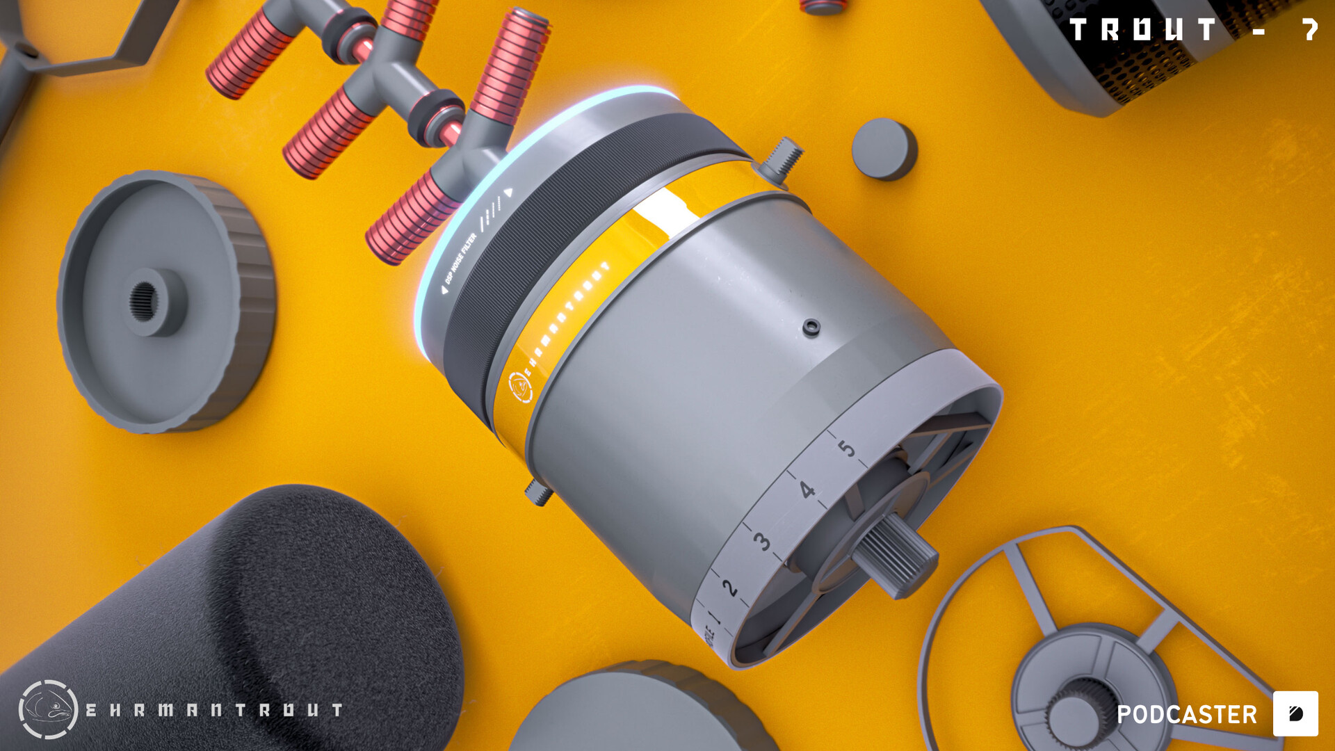 The Trout-7 is a microphone concept built for conversations by the esteemed Ehrmantrout brand! Some of you may know (or not) that I host the podcast over at Learn Squared. And with over 100 epsiodes under my belt, I have spent countless hours with my recording gear and tools, always thinking, 'Wouldn't it be cool if it did this?' So I've decided to use my design skills to develop some concepts in the podcasting space. And first up is this microphone, which is modelled after my trusty Shure SM7 (the mic you see in pretty much every podcast around). And the mic is great, but those who have ever worked with mics and pre-amps know there is still work to do with the raw audio, especially if you're recording in an untreated place. The Trout - 7 design solves this by compressing the pre and post-production steps I usually have to take and lets it all happen live in the mic. Bespoke capsules can be manipulated to reduce noise at source and on the fly, depending on the environment you're recording in, so you can plug in, hit record and leave with super clean audio. It will even allow you to set eq profiles as presets. Mics are also personal, and the ability to customise the mic, whether for appearance or a certain tactile feel, is available. As they say, the best mics are Ehrmantrouts!
